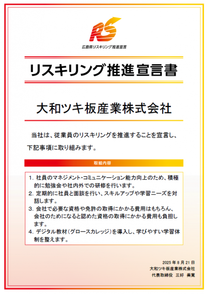 リスキリング推進宣言します! 総務部 2025.8.21 総務部からのお知らせです! この度、わが社では「広島県リスキリング推進宣言制度」に参加することにしました! もともと研修や勉強会、面談や資格補助などを実施し、スキルアップや経営参画意識の向上を目指していたわが社ですが、宣言を行うことでより積極的に人材育成・リスキリングに取り組んでいきたいと思っています! 経営方針の一つにもあげている「社員の成長を促し、物心両面の満足を目指す」を実現し、みんなで「ここで働けて良かったなあ」と思える会社にしていきましょうね!(^^♪ #大和ツキ板産業 #リスキリング #リスキリング推進宣言書 #広島県リスキリング推進宣言企業 #広島 #福山 #ツキ板 #突き板 #突板 #内装 #内装デザイン