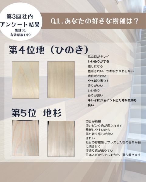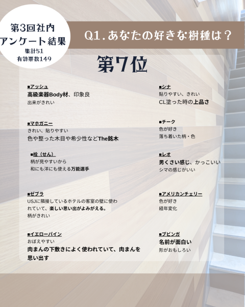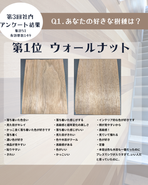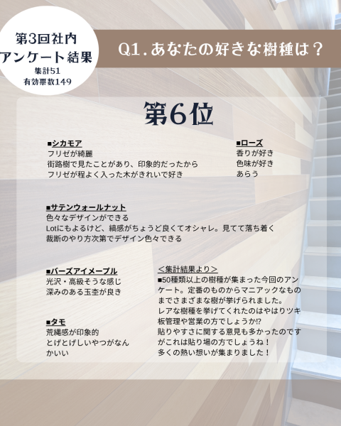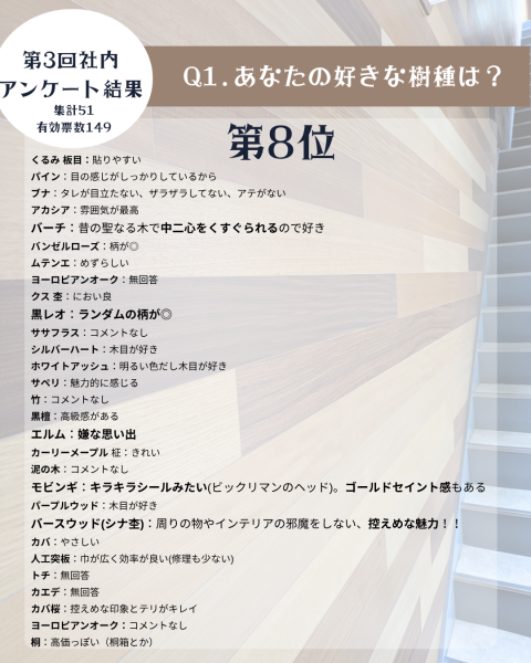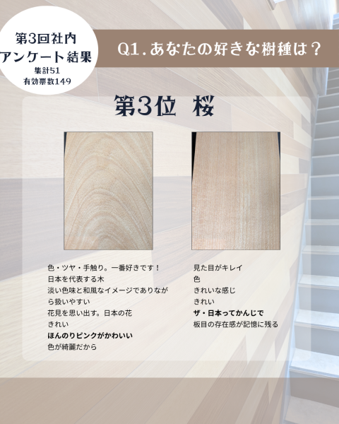 第3回社内アンケート結果発表 社内アンケート 2025.11.11 先日行った大和ツキ板第3回社内アンケート。 今回のテーマは Q1:あなたの好きな樹種は? Q2:最近買ったものの中で一番高かったものは? でした。 集計の結果、51人の方が投票してくださり有効票数は149票にもおよびました。 コメントから感じられる熱い想いの数々をぜひ見てみてください!(;'∀') どうでしたか? 私自身、恥ずかしながら初めて知る樹もありましたが、たくさんの樹種やコメントが集まり、 みんな本当に樹を好きなんだなぁと、とても嬉しくなりました♪ また、「最近買った一番高かったもの」では不動産から胃薬まで、さまざまな回答があつまりました! アンケートを見ていると、みんなの生活が伝わってきて面白いですね♪