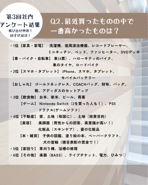 また、「最近買った一番高かったもの」では不動産から胃薬まで、さまざまな回答があつまりました!