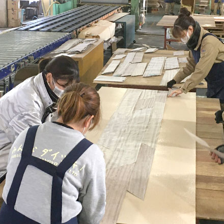 シミ・汚れやツキ板の隙間・重なり、下地のベニヤにも異常が無いか1枚1枚検査し、必要なものは修理します。