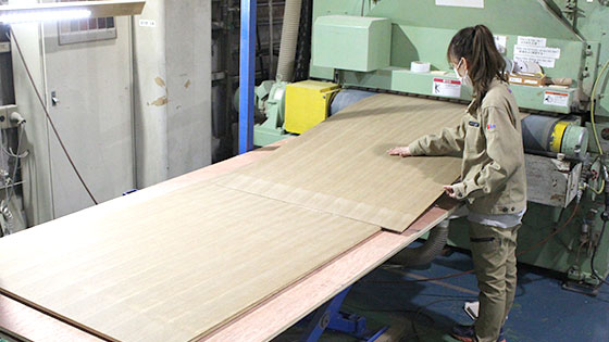 ボンドの塗布には機械を使用しますが、ツキ板の貼り付けはすべて手作業で行っています。