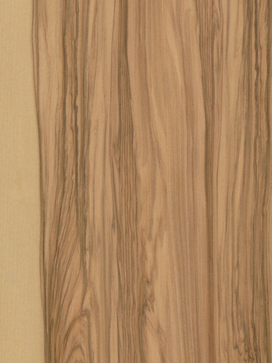 心材は薄い茶色の中に濃い茶色の縞が揺れるように現れる独特な木目を持っており、個体によって異なる模様を作り出します。ツキ板としてはブック貼りやランダム貼りで使うケースが多く、色の濃淡をうまく使ったブック貼りは他の樹種では見られない印象的なデザインを作ることが出来ます。また、個体によって木目の違いが大きいので、木との出会いを楽しめる樹種でもあります。